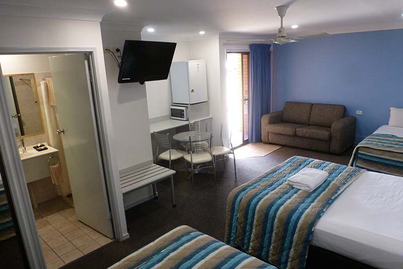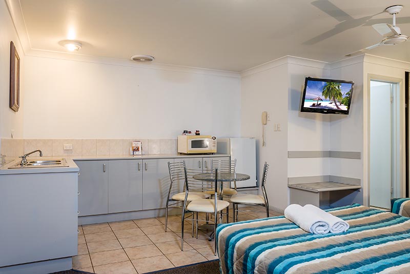 Our Deluxe Twin room with Kitchen has the added convenience of a full size kitchen. These are a modern room that can interconnect with another double or twin room. All rooms have tea & coffee facilities, microwave ovens and split system air conditioning.