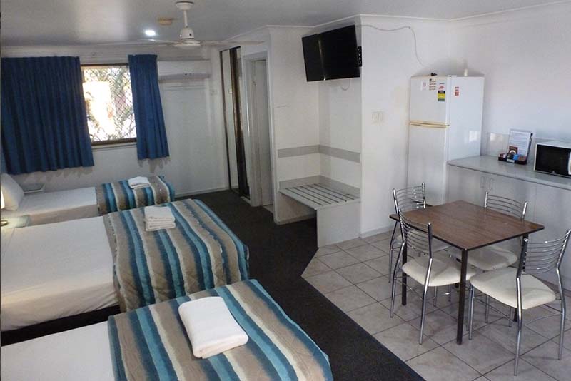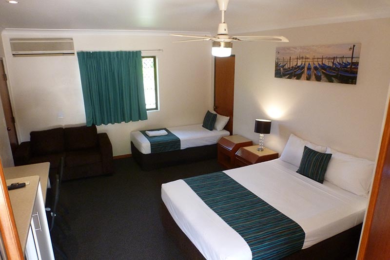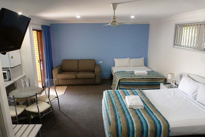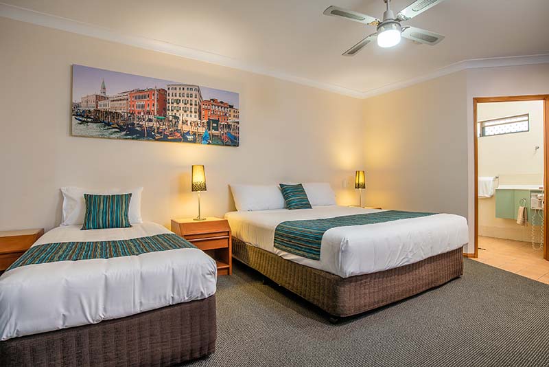 Our family room with kitchen sleeps four people. It has the added convenience of a kitchen for longer extended stays. The bedding configuration is either 2 queen beds or 1 queen bed and 2 single beds. Confirm your preference with the property. Our family room with kitchen can adjoin a queen room for those larger families. This brings them to a two room option with 2 bathrooms. Enquire at property.